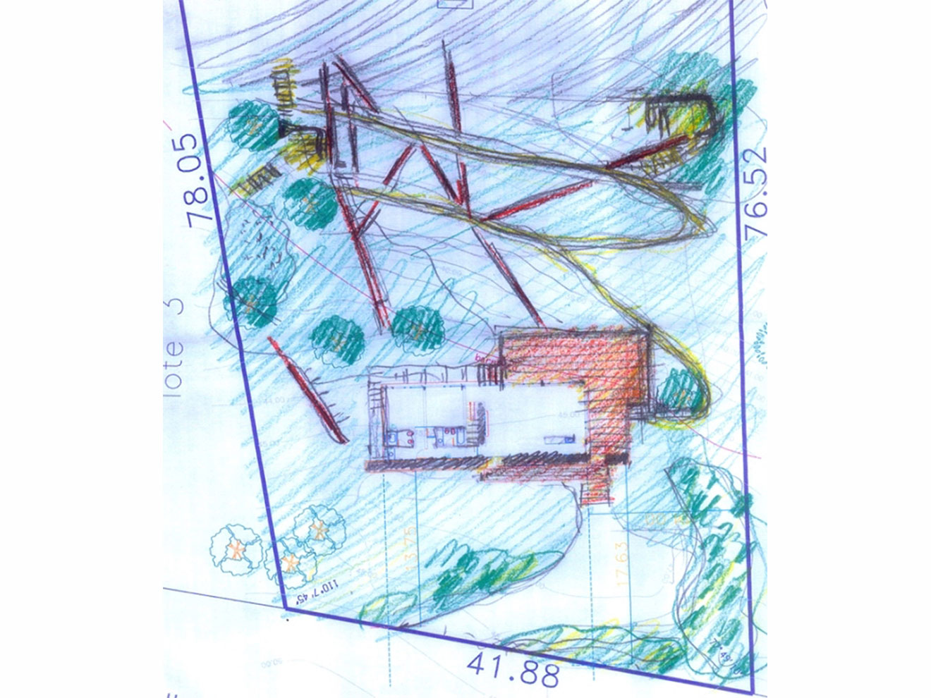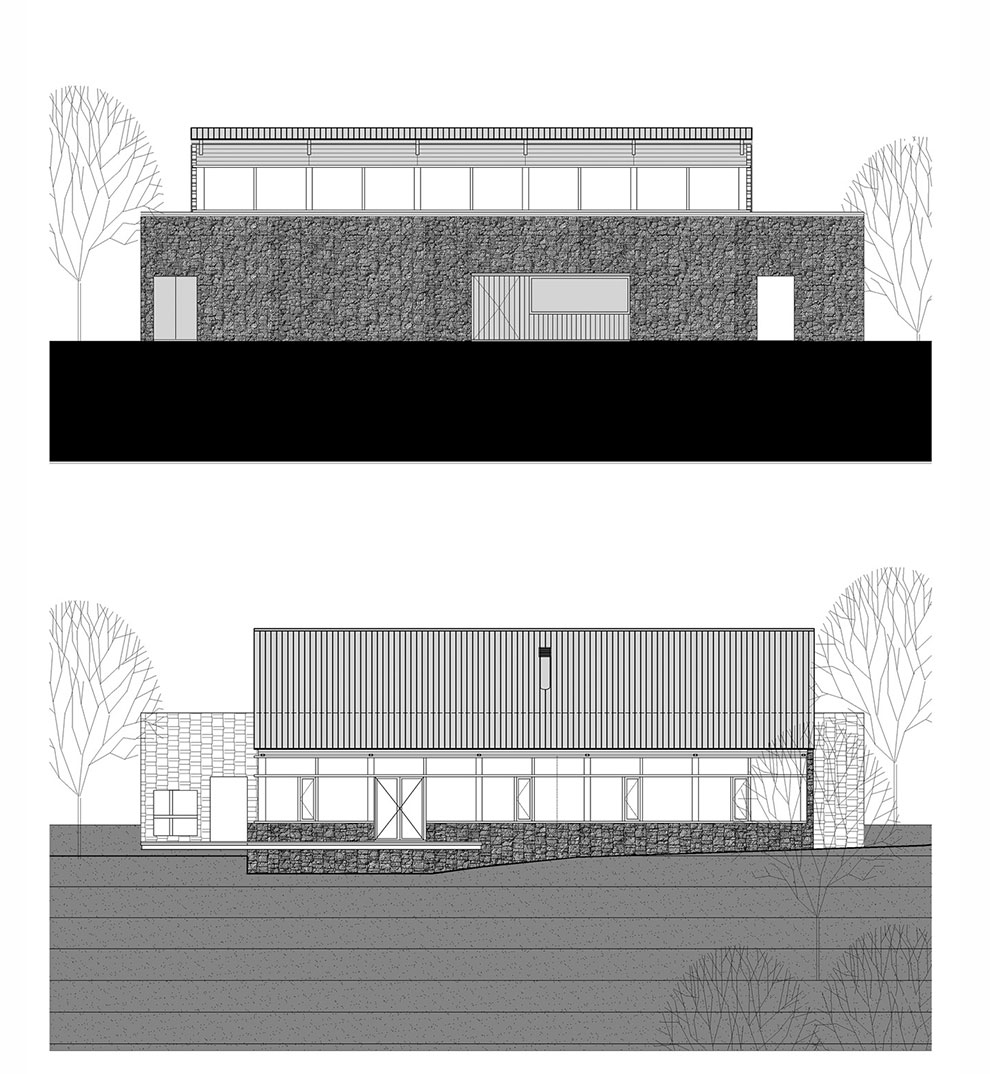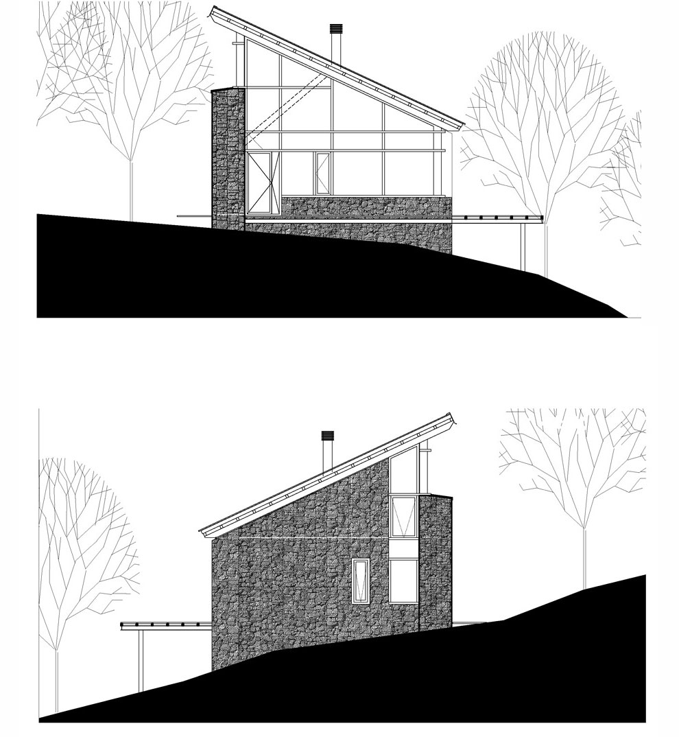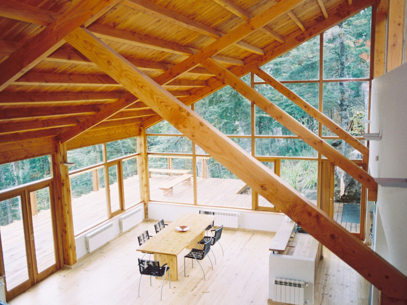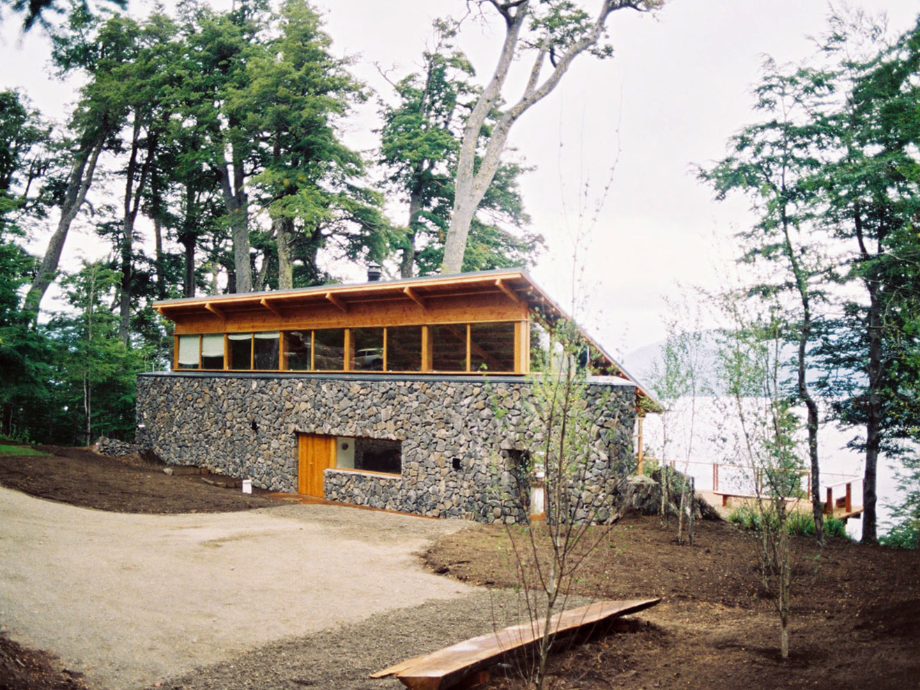 Rodeada de un bosque de coihues, la casa se asienta en el punto de quiebre de la ladera, con una clara identificación: un muro de piedra de 25 metros de longitud y 4.5 m de altura y un metro de espesor, que contiene todos los servicios.