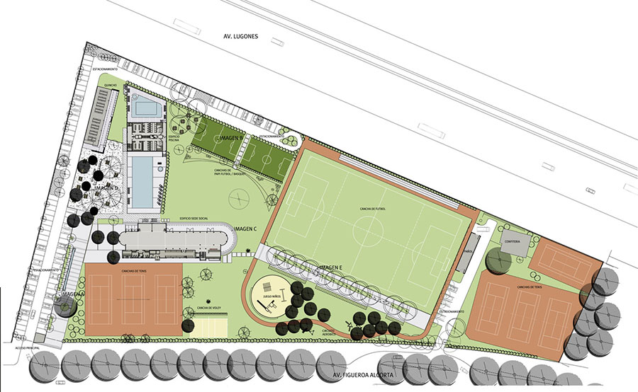 Se decide entonces potenciar las arboledas existentes, caracterizar y recuperar la sede social y emplazar el resto de los programas solicitados y propuestos de modo tal de generar un dialogo entre lo natural y lo artificial, entre lo nuevo y lo heredado. Rescatando la historia del lugar y realzando la potencia del conjunto.