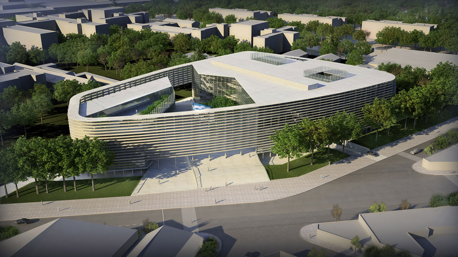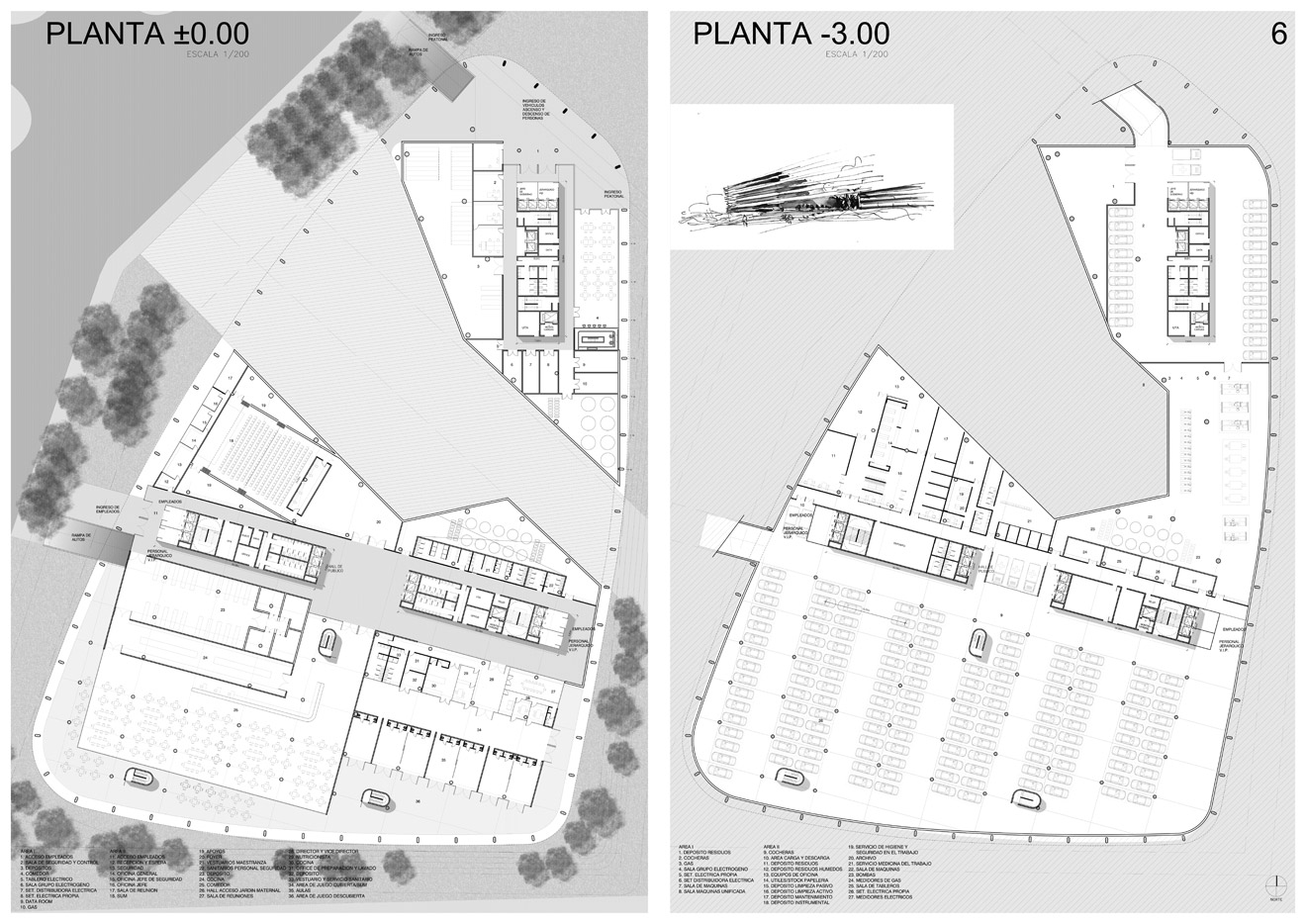 Dentro de la piel, materializada a través de parasoles de hormigón, se disponen los dos edificios, uno al Norte el otro al Sur, articulados a través de una plaza central, verdadera plaza cívica, caracterizada por los ombúes existentes. Desde este espacio, al que se accede por una escalinata de fuertes características urbanas, se producen los accesos a los edificios.