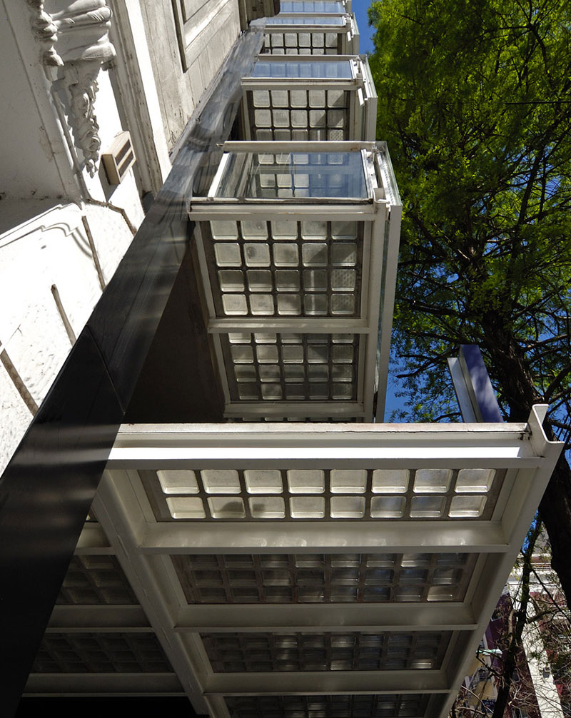 Siguiendo esta lógica es que la libertad de planta se expresa en el frente a través de una fachada transparente, a la manera de un courtain wall y una serie de balcones con piso de ladrillo de vidrio. La marquesina comercial en planta baja también es una estructura metálica de perfiles y ladrillo de vidrio.