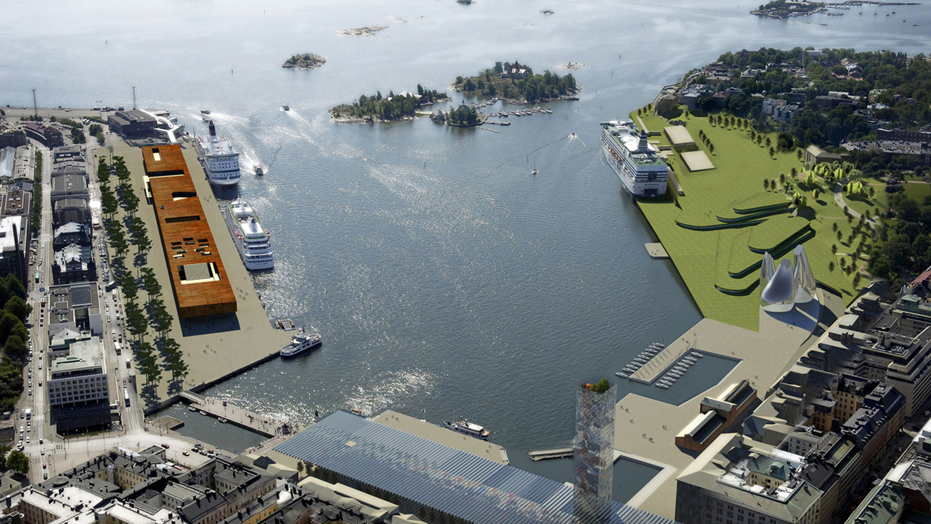 La propuesta para el puerto de cruceros de Helsinki, potenciaba las explanadas como uso público, jerarquizando el area del mercado con una cubierta transparente, expandiendo el parque existente hacia el mar, tapizando a modo de un edificio verde las terminales de cruceros y generando un nuevo museo como pieza escultórica.