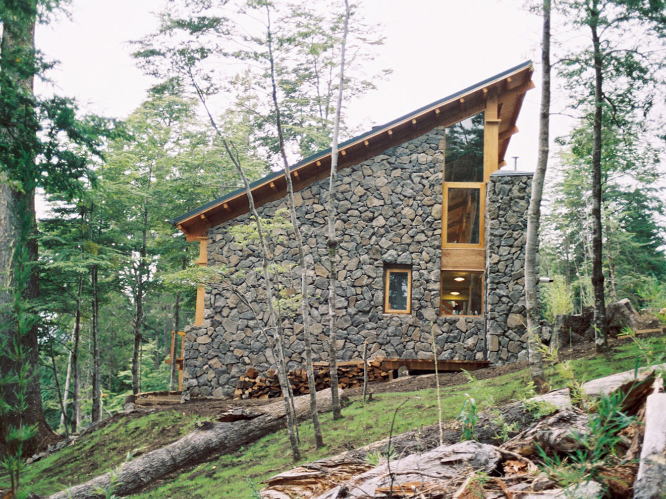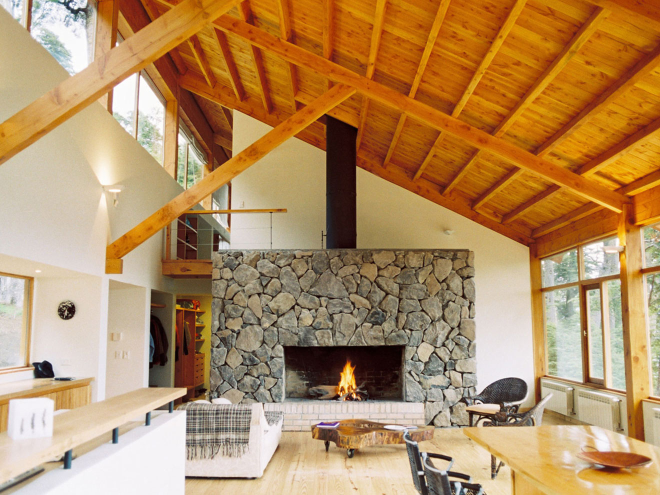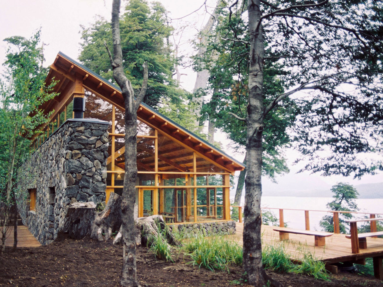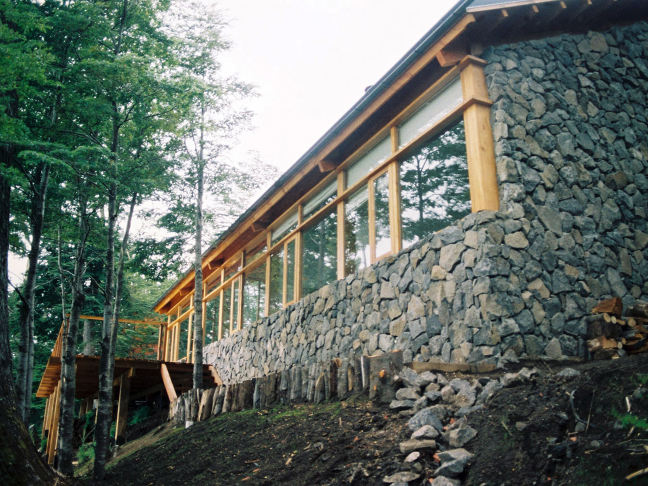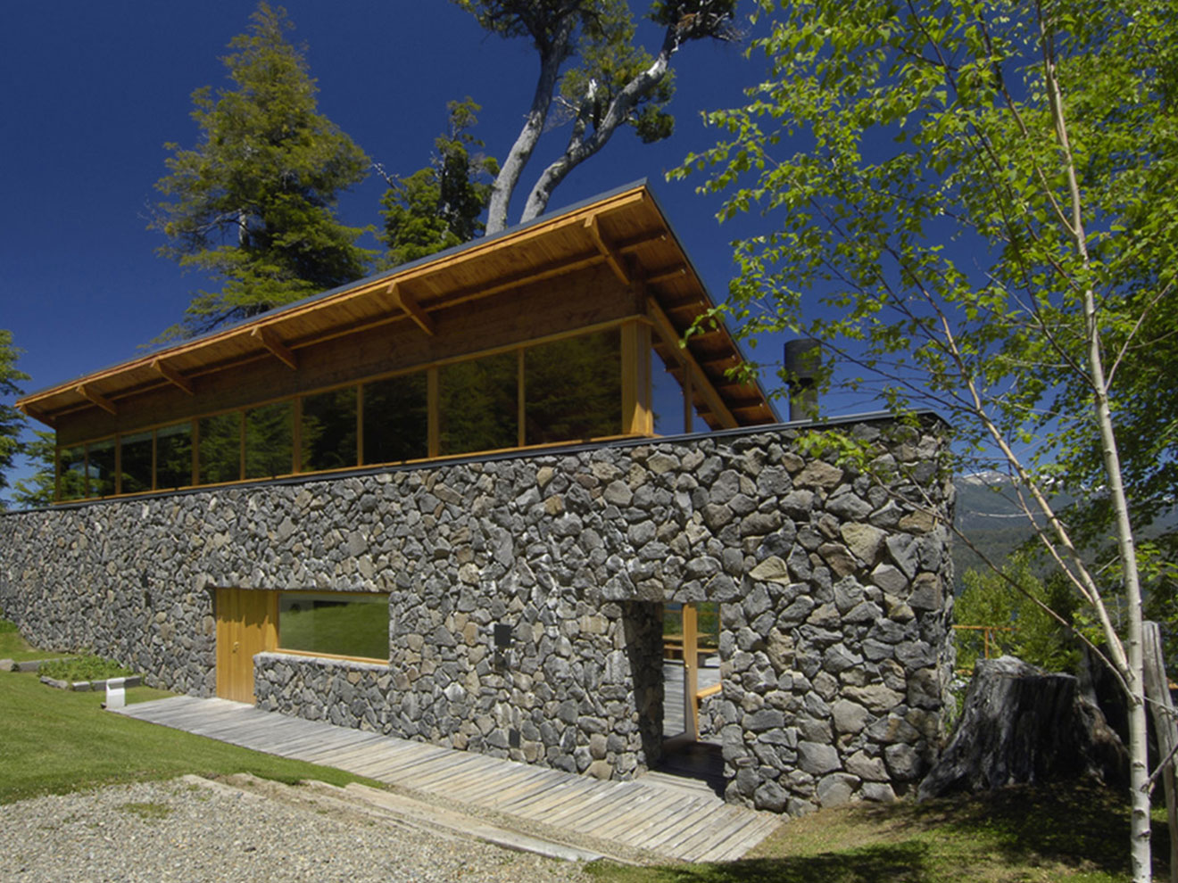 Rodeada de un bosque de coihues, la casa se asienta en el punto de quiebre de la ladera, con una clara identificación: un muro de piedra de 25 metros de longitud y 4.5 m de altura y un metro de espesor, que contiene todos los servicios.