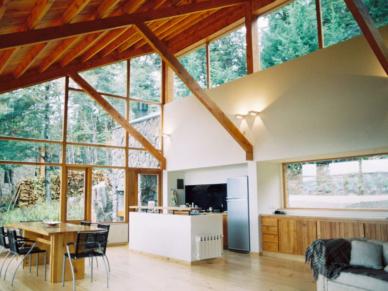 Apoyada sobre este muro la casa es un prisma de cristal, con cubierta a un agua, paralela a la pendiente de la montaña para atemperar los vientos de la cordillera.