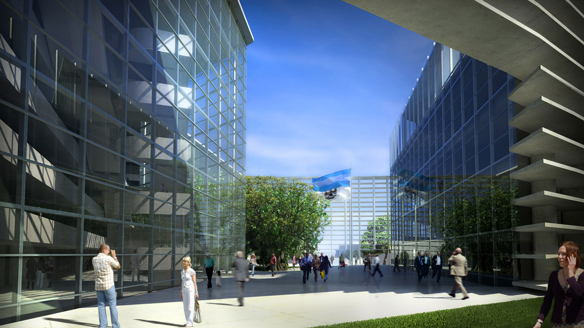 Dentro de la piel, materializada a través de parasoles de hormigón, se disponen los dos edificios, uno al Norte el otro al Sur, articulados a través de una plaza central, verdadera plaza cívica, caracterizada por los ombúes existentes. Desde este espacio, al que se accede por una escalinata de fuertes características urbanas, se producen los accesos a los edificios.