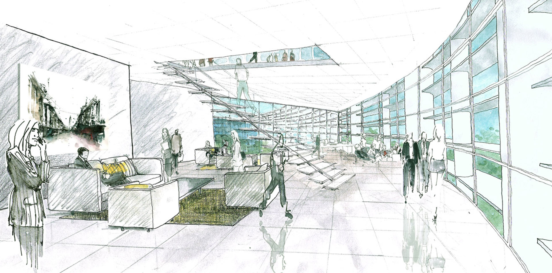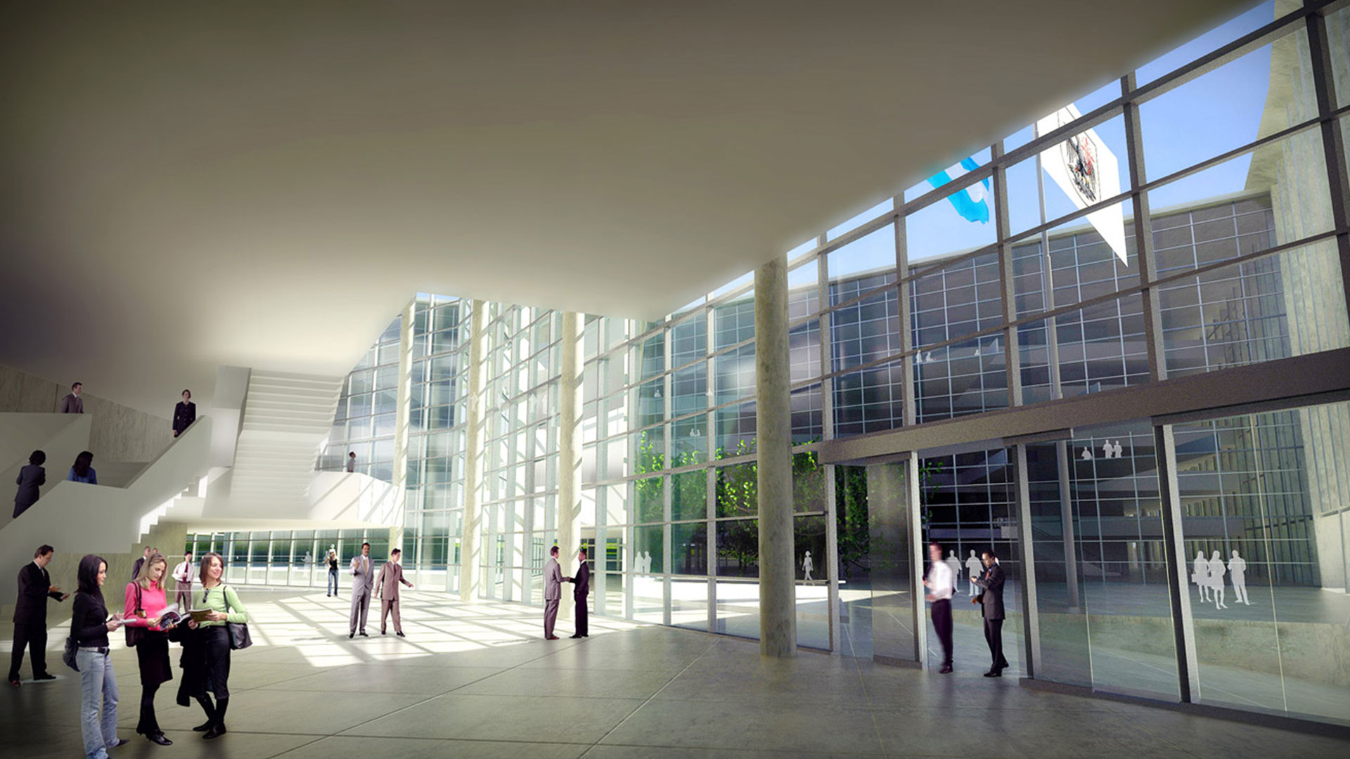 Los halles de ambos edificios, tratados como espacios de circulaciones y movimiento de grandes flujo de gente, continúan el espíritu urbano de la plaza central. Múltiples alturas, escaleras mecánicas y los núcleos verticales, recrean el espacio propuesto.