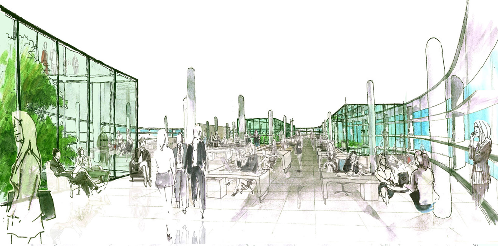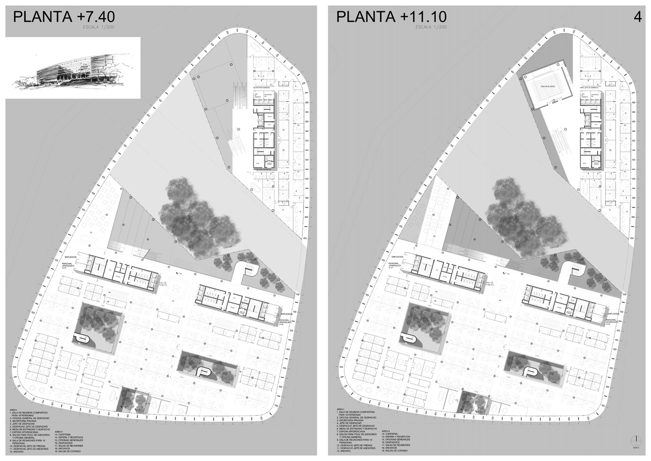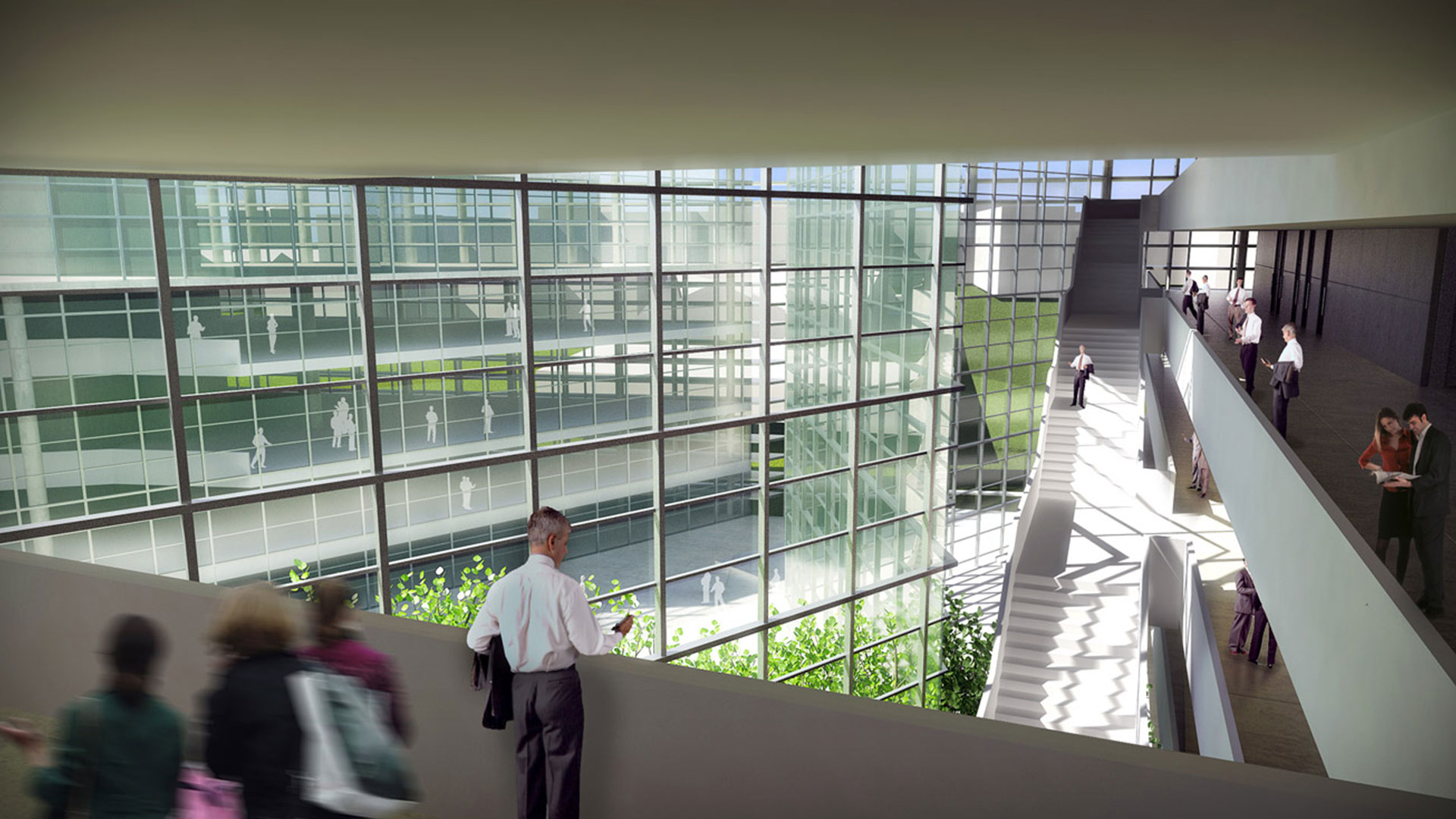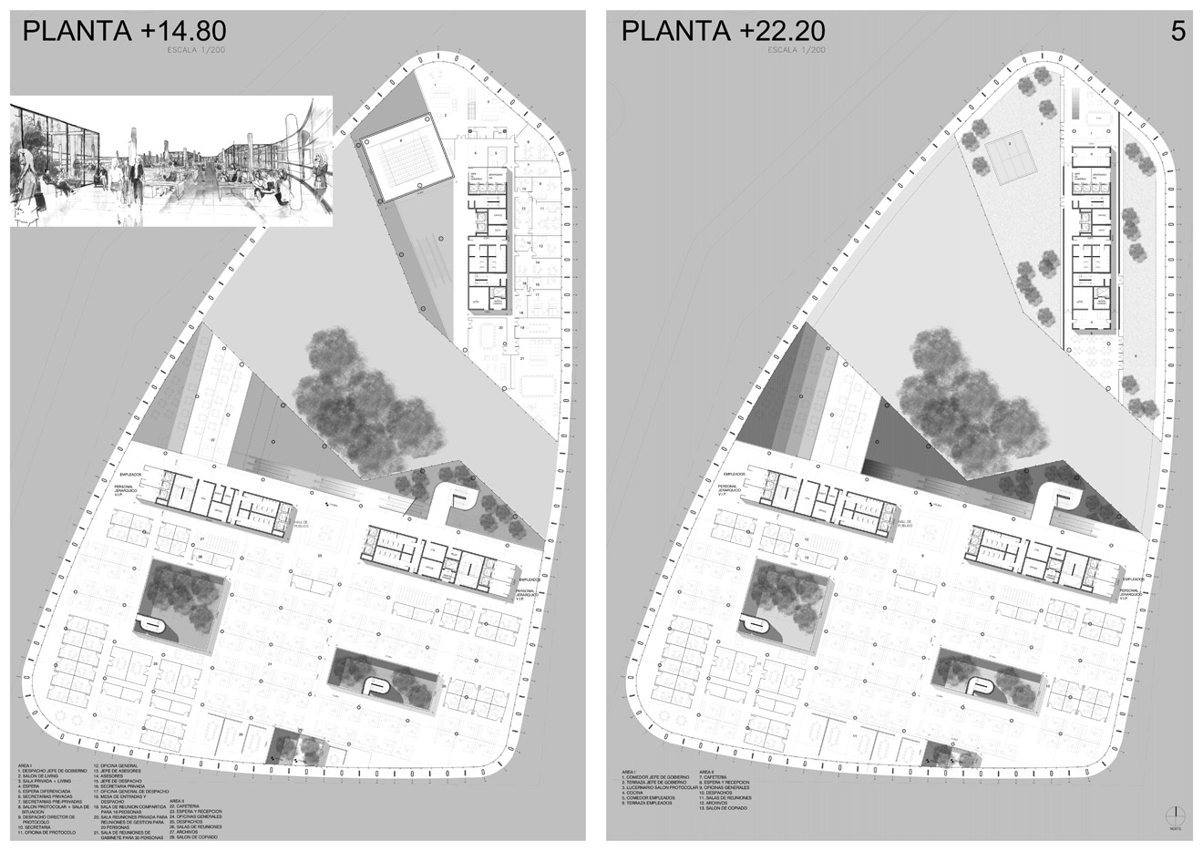 Las superficies de trabajo son tratadas como espacios de amplia flexibilidad, óptima iluminación natural y diversidad de paisaje interior. La propuesta incluye patios interiores con vegetación, patios de fachada con terrazas para salir a fumar, espacios de estar, así como perspectivas hacia la plaza central desde las cafeterías.