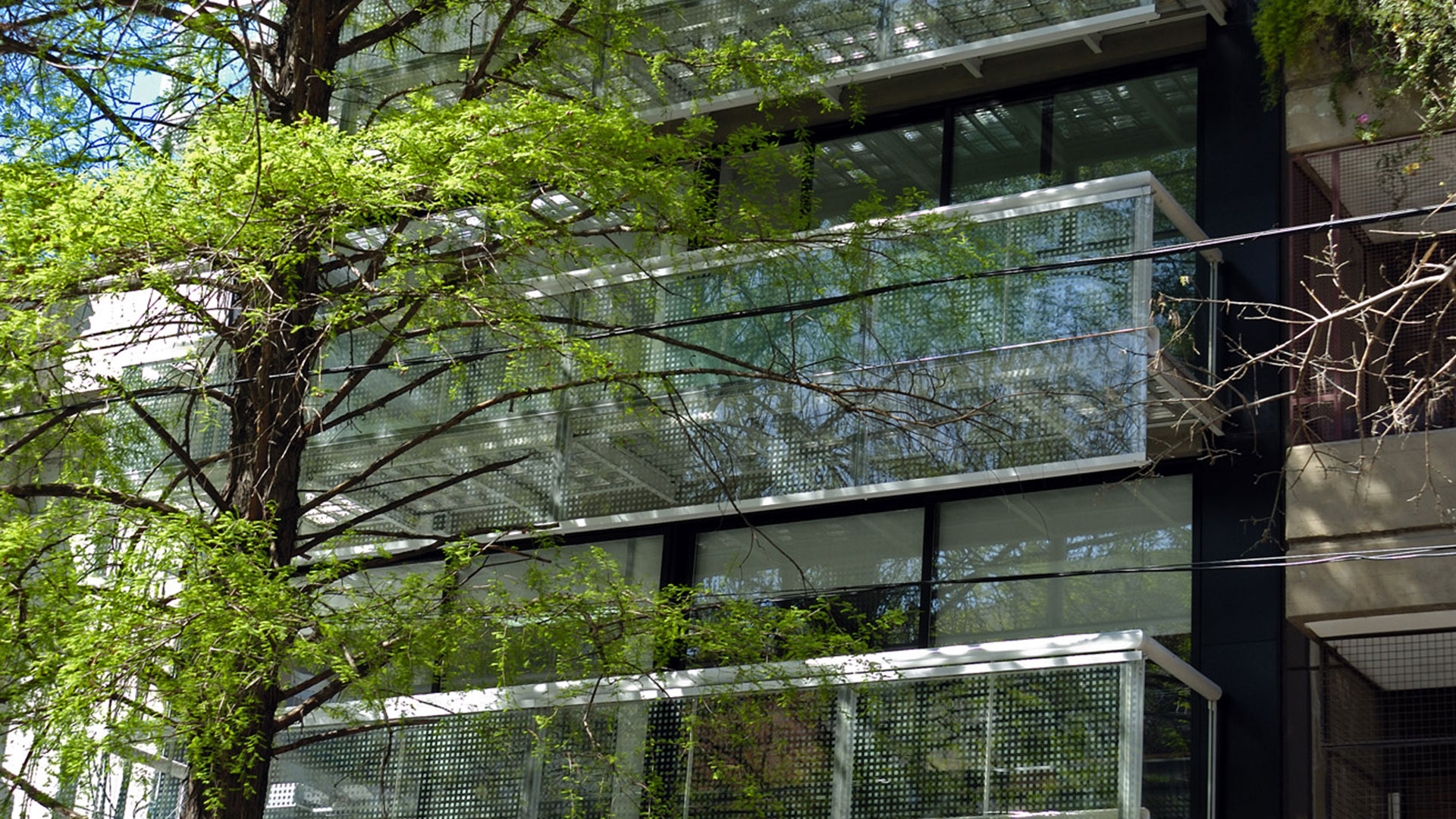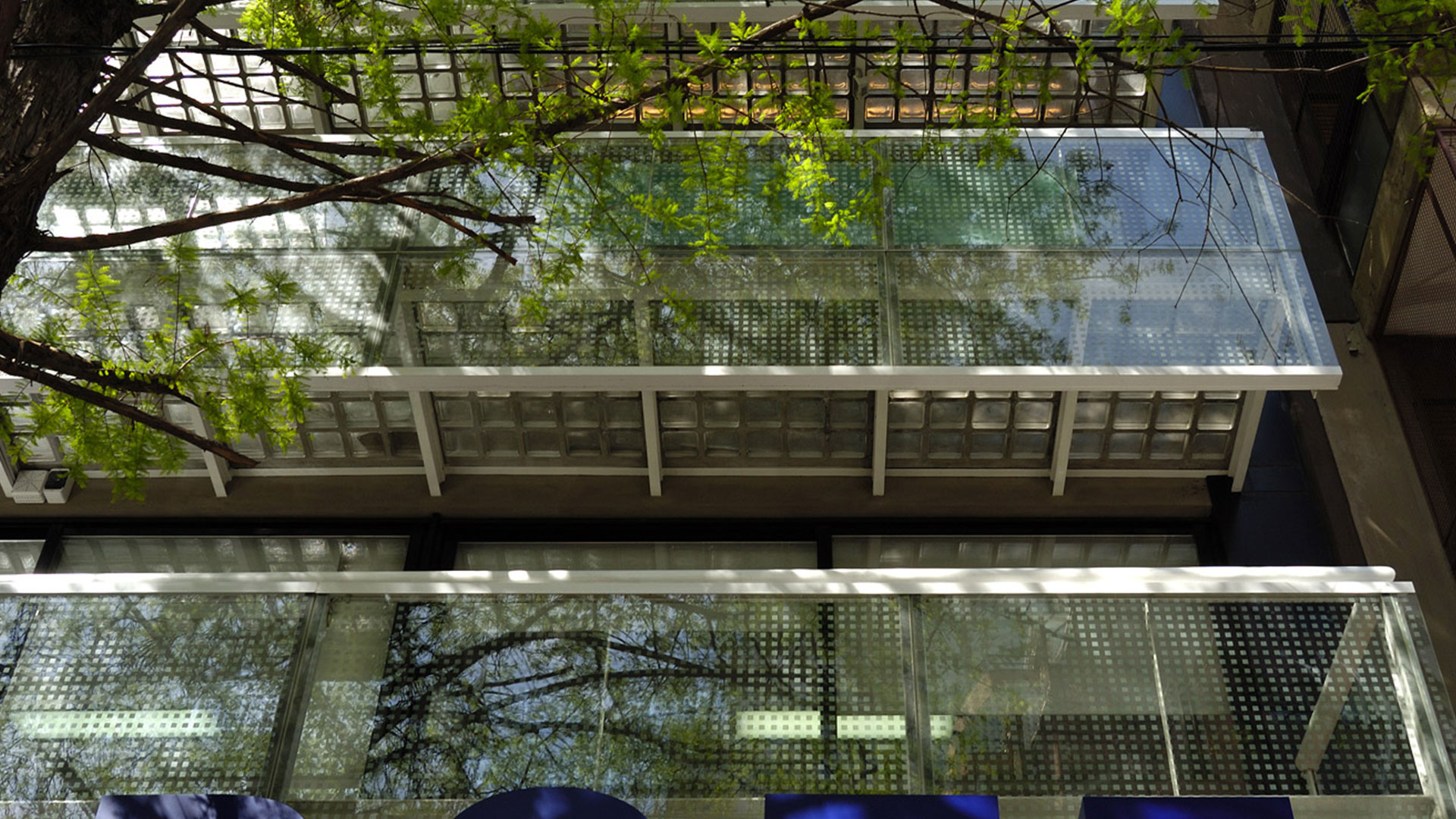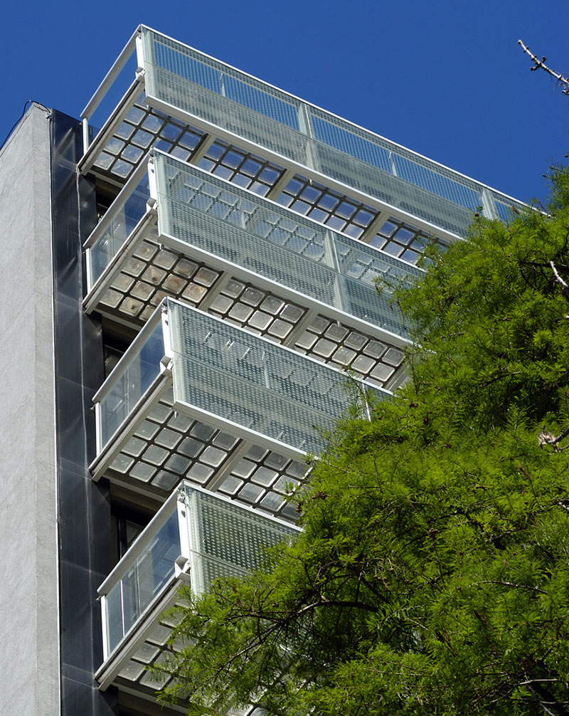 Siguiendo esta lógica es que la libertad de planta se expresa en el frente a través de una fachada transparente, a la manera de un courtain wall y una serie de balcones con piso de ladrillo de vidrio. La marquesina comercial en planta baja también es una estructura metálica de perfiles y ladrillo de vidrio.