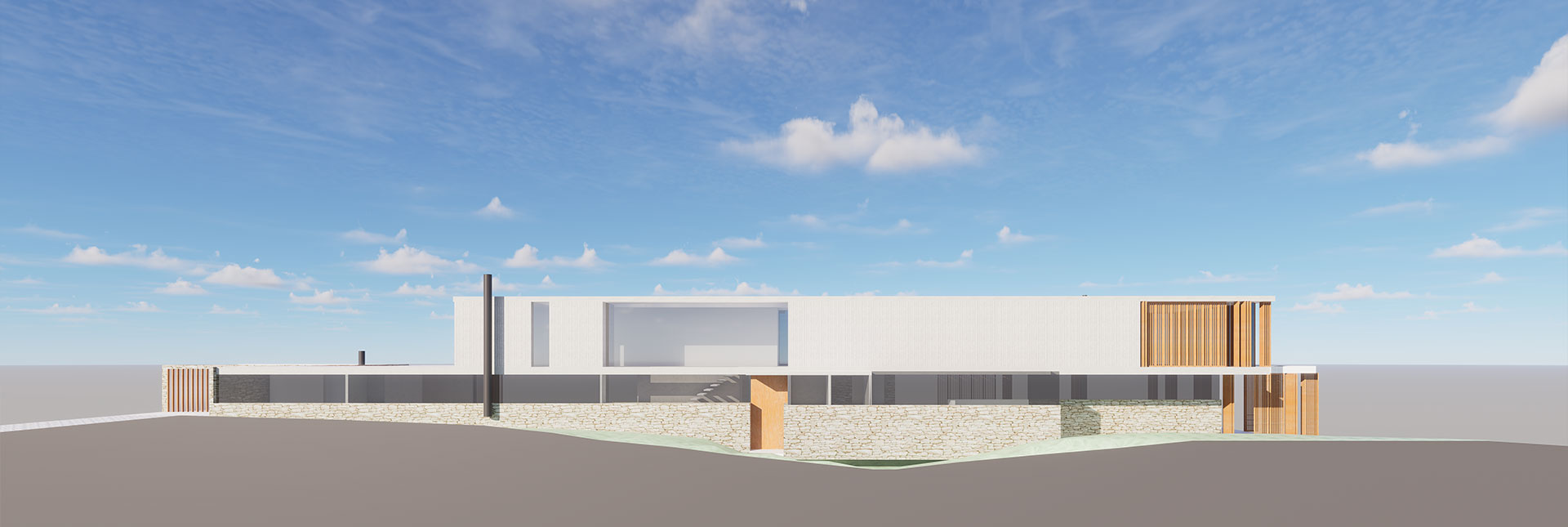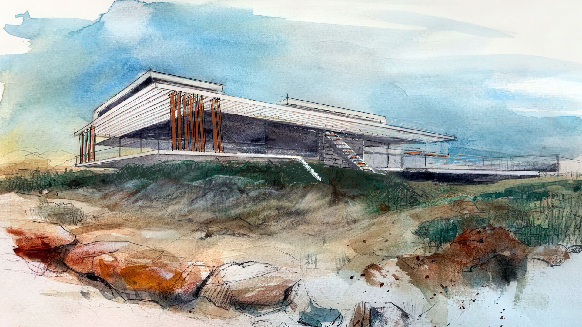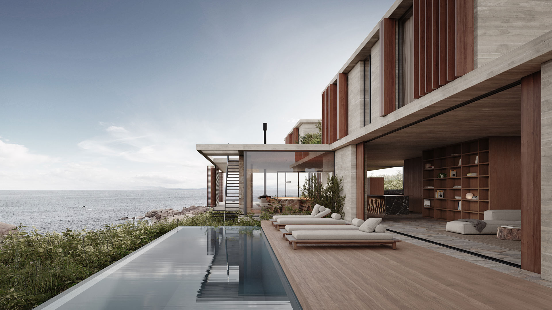 En un terreno de suave pendiente hacia el mar, la propuesta se destaca por líneas geométricas claras que se insertan en el paisaje de rocas arena y océano, penetrando a través de la transparencia en el interior.