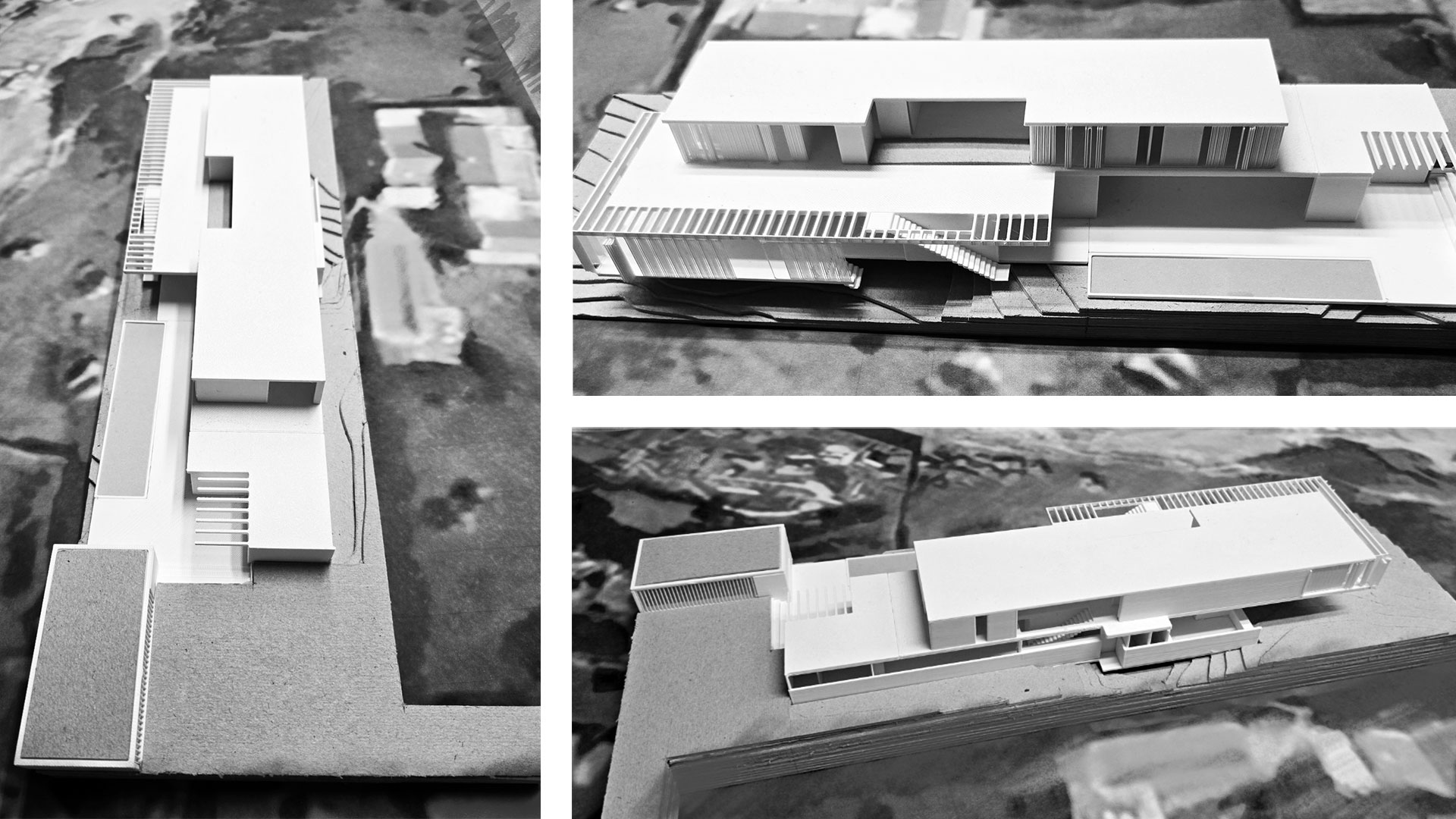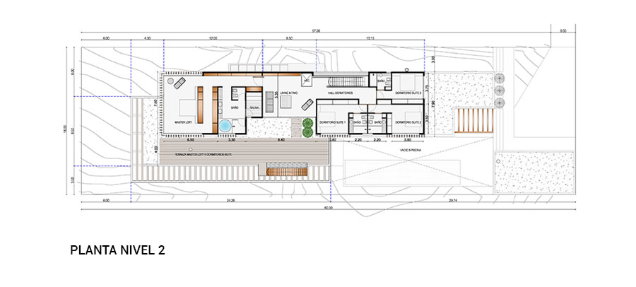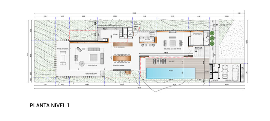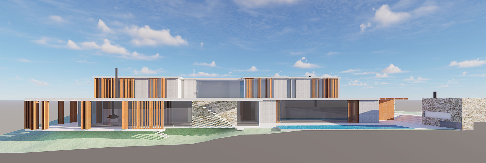 En un terreno de suave pendiente hacia el mar, la propuesta se destaca por líneas geométricas claras que se insertan en el paisaje de rocas arena y océano, penetrando a través de la transparencia en el interior.