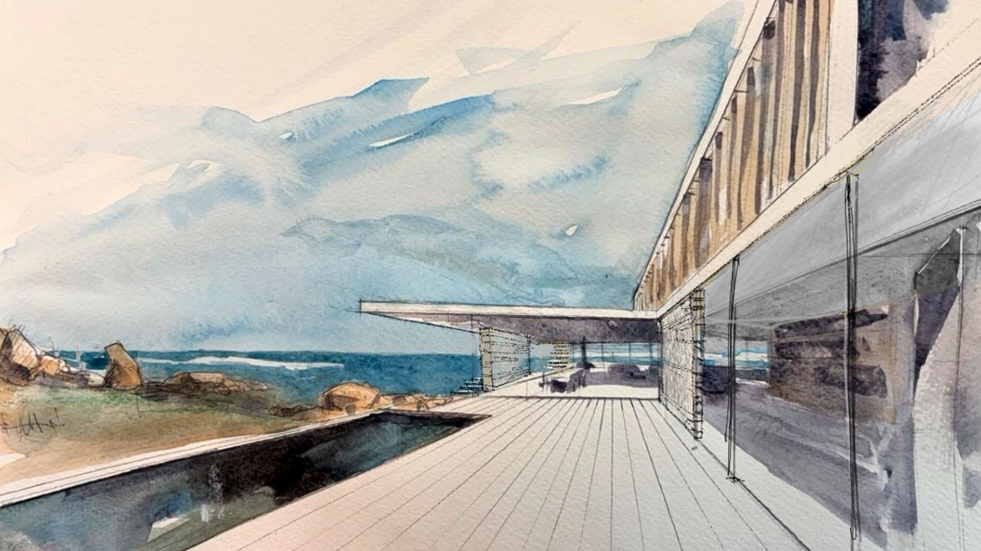 En un terreno de suave pendiente hacia el mar, la propuesta se destaca por líneas geométricas claras que se insertan en el paisaje de rocas arena y océano, penetrando a través de la transparencia en el interior.